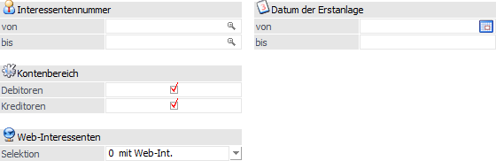 In diesem Bereich kann die Grundselektion vorgenommen werden, wobei die Einstellung "Kontenbereich" und "Web-Interessenten - Selektion" benutzerspezifisch gespeichert werden.