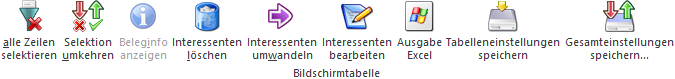 Nach dem Auslösen der Anzeige (siehe Button "Anzeigen") wird die Tabelle gemäß zuvor getätigten Selektion gefüllt. Von hieraus könnten die Interessenten bearbeitet, gewandelt oder gelöscht werden.