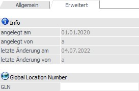 In dem Unterregister "Erweitert" kann u.a. die GLN hinterlegt werden. Zusätzlich stehen Infos z.B. zur Anlage zur Verfügung.