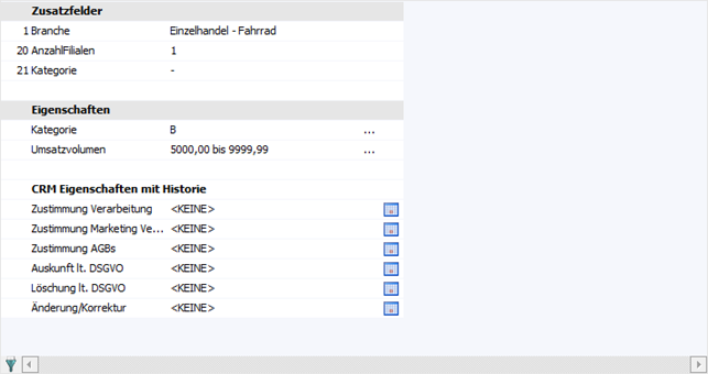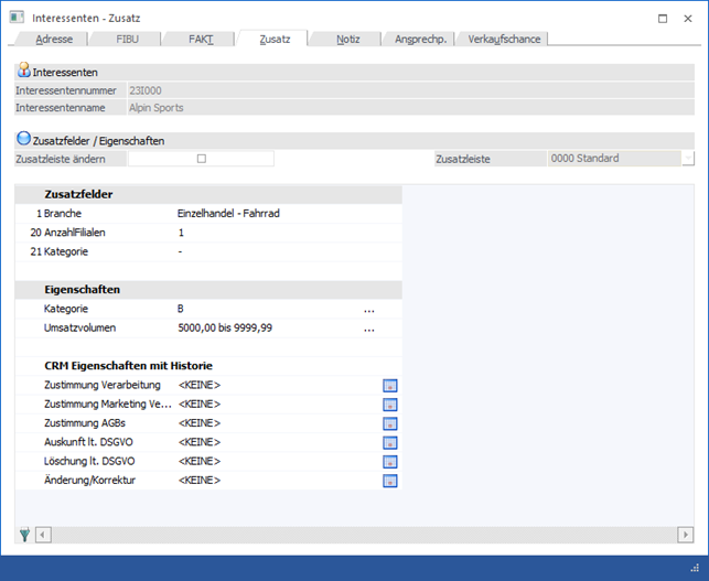 Im Register "Zusatz" der Interessentenverwaltung können Zusatzfelder und Eigenschaften des Interessenten hinterlegt werden.