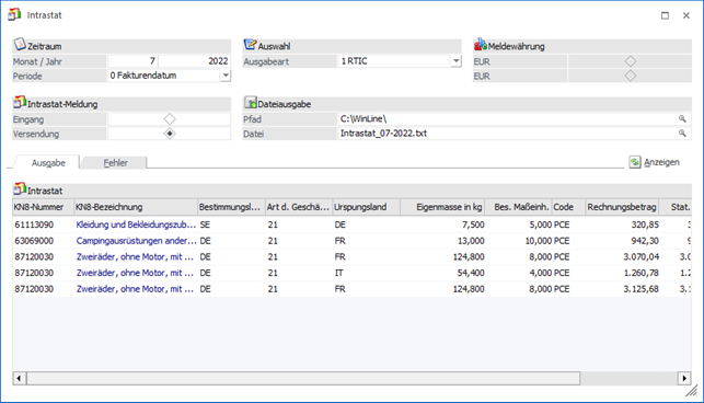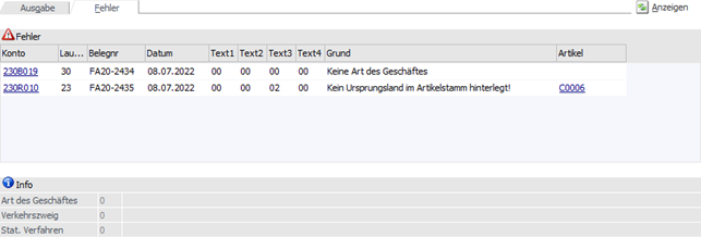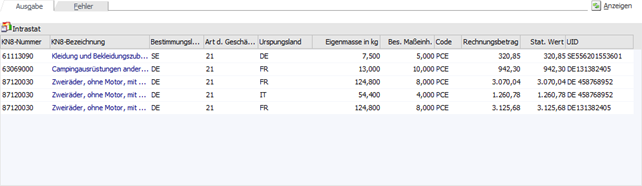 Nach Anwahl des Buttons "Anzeigen" werden die Fakturen gemäß Selektion in der Tabelle "Ausgabe" oder "Fehler" aufgelistet. Sollte ein allgemeines Problem vorliegen (z.B. Zugriff auf den KN8-Warenkatalog ist nicht möglich), so wird ein entsprechendes Protokoll in den Spooler abgelegt.