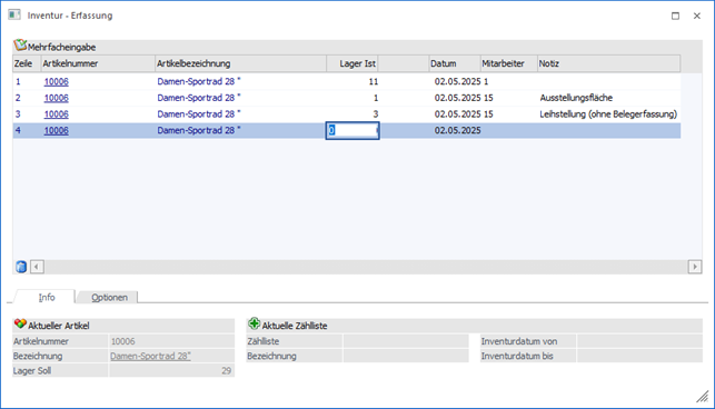 In die Mehrfacherfassung kann über die Spalte "Weitere Eingaben" der Einzelerfassung gewechselt werden. Hier können mehrere Erfassungszeilen zu einem Artikel hinterlegt werden, wobei folgende Punkte zu berücksichtigen sind: