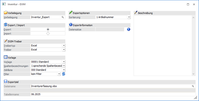 Bei einem Export werden die Artikelzeilen immer mit der Inventurerfassungsmenge 0 exportiert.