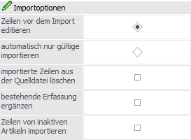 Selektion und steuert diverse Prüfungsvorgaben des Imports (z.B.