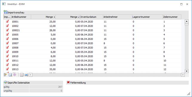 Wenn bei einem Import im "Inventur - EXIM" die Option "Zeilen vor dem Import editieren" ausgewählt wurde, so wird der Bereich "Importvorschau" geöffnet. In diesem ist nach einer Prüfung ersichtlich, welche Inventurerfassungen importiert werden können bzw. welcher Daten nicht korrekt sind.