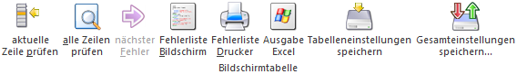 Die im ersten Schritt notwendige Prüfung der Datensätze kann entweder Satzweise oder über alle Zeilen erfolgen. Hierzu stehen die Tabellenbuttons "aktuelle Zeile prüfen" und "alle Zeilen prüfen" zur Verfügung.