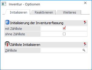 Durch die Anwahl des Buttons "Optionen" im Programm "Inventur" (Register Eingabe) können u.a. nicht gebuchte Inventurerfassungen initialisiert werden. Das Fenster untergliedert sich dabei in 3 Register.