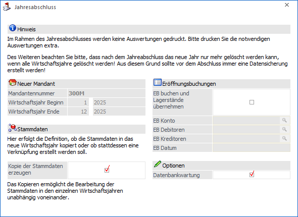 Der Jahresabschluss überträgt die Stammdaten des laufenden Wirtschaftsjahres in das neue Wirtschaftsjahr. Die Daten des alten Wirtschaftsjahres müssen vor der Durchführung des Jahresabschlusses gesichert werden!