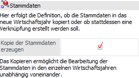 Mittels Option "Kopie der Stammdaten erzeugen" kann bestimmt werden, ob die Stammdaten im Zuge des Jahresabschluss in das neu anzulegende Wirtschaftsjahr kopiert werden sollen (aktive Option) oder ob die Stammdaten jahresübergreifend verwendet werden sollen (Option nicht aktiv). Je nach Auswahl ändert sich auch der Beschreibungstext.