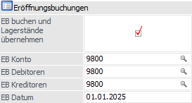 Bei Aktivierung dieser Option werden nach dem Jahresabschluss die Eröffnungsbuchungen der WinLine FIBU getätigt, sowie die Lagerstandsübernahme der WinLine FAKT durchgeführt. Hierfür müssen die folgenden Felder mit EB Konten bzw. einem EB Datum versehen werden.