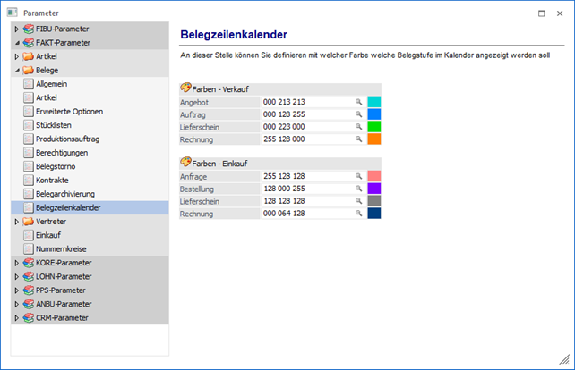 Die Farbgebung von Listen des Typs "28 - Belege" kann pro Belegstufe gesteuert werden. Hierfür steht in den FAKT-Parametern der Bereich "Belegzeilenkalender" zur Verfügung.