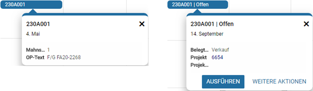 Im Tooltip werden im Standard keine Buttons dargestellt. Eine Ausnahme bildet der Kalender auf Grundlage von Belegen. Hier werden automatisch die Buttons "Ausführen" und "Weitere Aktionen" zur Verfügung gestellt.