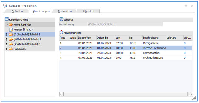 Im Register "Abweichungen" kann die Arbeitszeit des Schemas verlängert oder verkürzt werden.