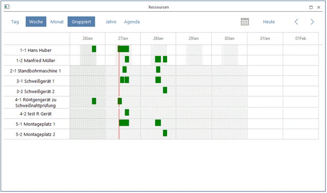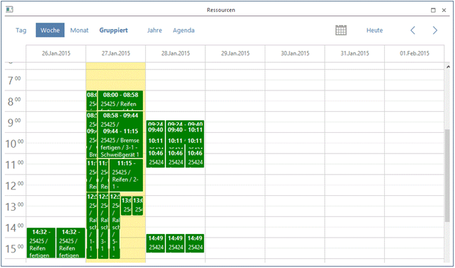 Die Kalenderansicht kann in einer Tag-, Woche-, Monat-, oder Jahr-Darstellungsform organisiert werden. Zusätzlich können die Kalendereinträge (Balken) in einer gruppierten oder nicht gruppierten Ansicht dargestellt werden.