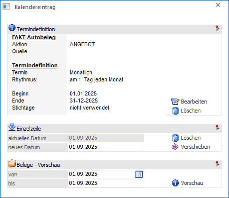 Der Termin (im Autobeleg=Beleg) kann auf ein neues Datum (Eingabefeld "neues Datum") verschoben werden.