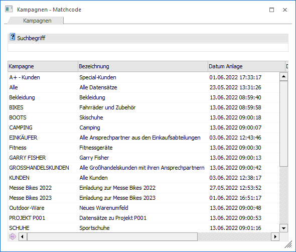 Wenn der Fokus in dem Feld "Kampagne" liegt und das Lupen-Symbol bzw. die Taste F9 gedrückt wird, dann öffnet sich das Programm "Kampagnen - Matchcode". An dieser Stelle kann gezielt nach Kampagnen gesucht werden.