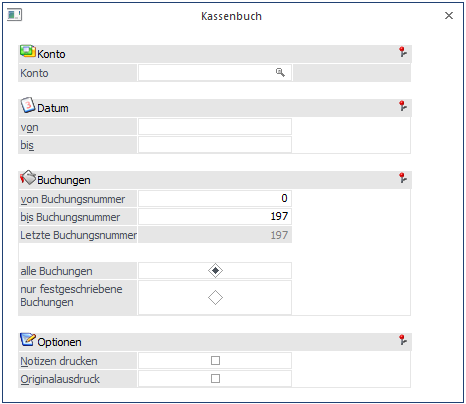 Im Kassenbuch werden sowohl beim Andruck der Buchungen, als auch bei den Summen die außerbücherlichen Salden (Buchungen mit einer Steuerzeile "Pagatorische Aufwände/Erlöse" aktiv) nicht berücksichtigt.