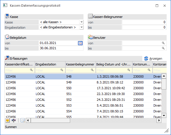 Hier können die Belegnummer eingetragen werden, welche angezeigt werden sollen. Beim Vorschlag von 0 bis 0 werden alle Belege angezeigt.