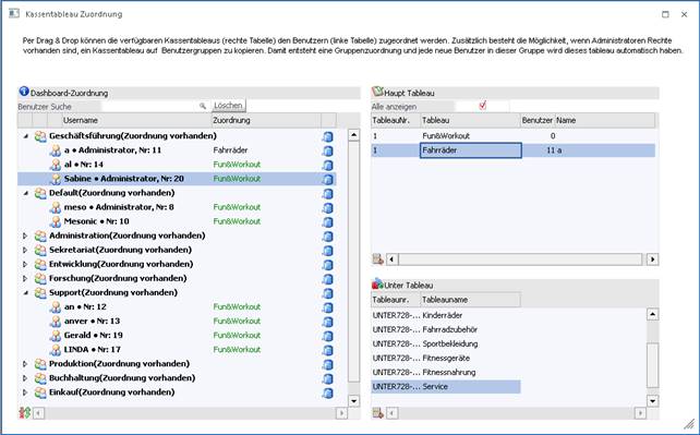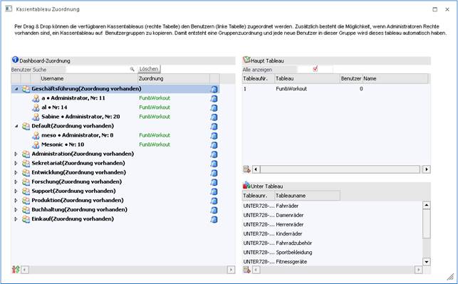 Im linken Bereich können bereits angelegte Dashboards für die Kasse per Drag & Drop einen beliebigen Benutzer zugewiesen oder gelöscht werden. Falls dieses Fenster von einem Administrator geöffnet wird, ist jeder Benutzer und jedes erstellte Dashboard sichtbar. Hingegen werden bei einem Benutzer ohne Administrationsrechte nur der gerade angemeldete Benutzer und seine erstellten Dashboards angezeigt.