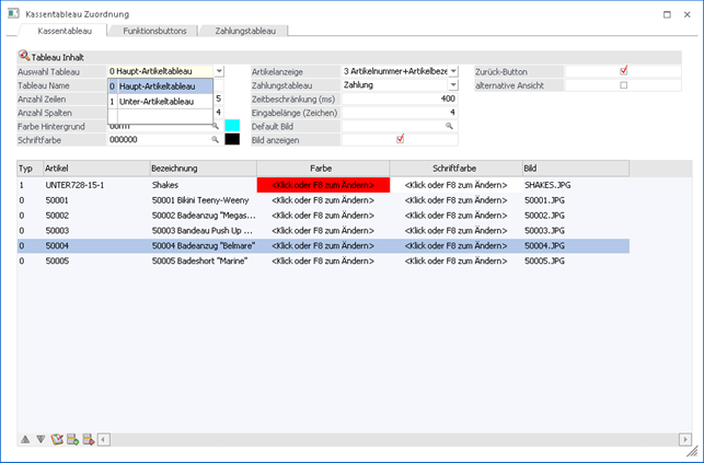 In dieser Tabelle können Artikel bzw. Unterartikel-Tableaus hinterlegt werden. Folgende Optionen stehen zur Verfügung: