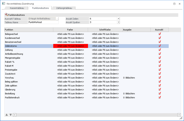Die Funktionen können mittels der Button "Zeile nach oben" bzw. "Zeile nach unten" beliebig verschoben werden. Die Anzeige dieser Buttons erfolgt nach der Reihenfolge der Spalten, mit der Ausnahme des Zahlungsbuttons, dieser befindet sich immer an erster Stelle.