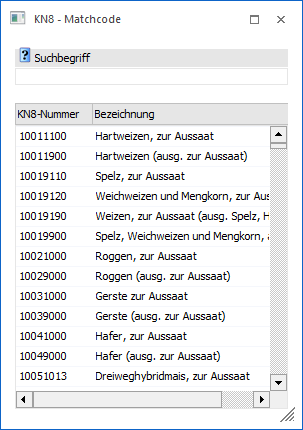 In diesem Fenster kann nach allen bereits angelegten KN8-Warennummern gesucht werden.