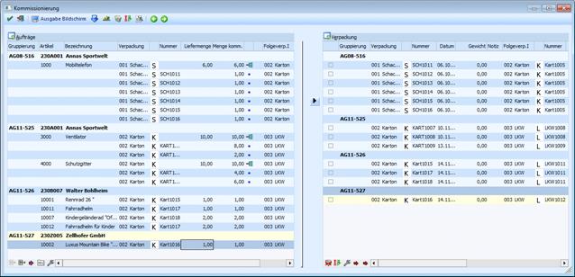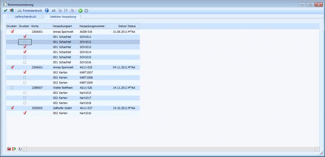 angezeigt. Hier können neben der Selektion der Aufträge, die Verpackungen für