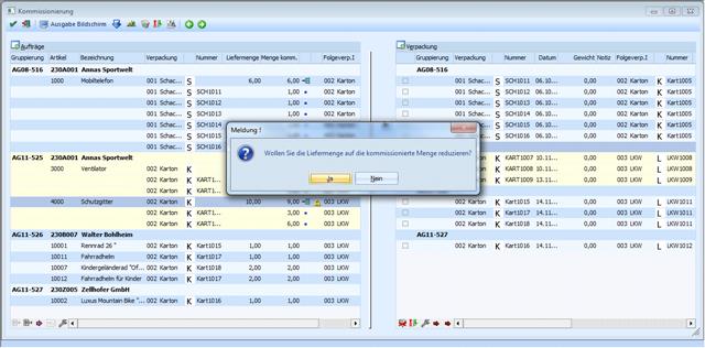 Eine Unterkommissionierung ist möglich, allerdings kann der Lieferschein im Folgeschritt nicht automatisch gedruckt werden. Eine Unterkommissionierung wird mit einem gelben Rufzeichen markiert. Mittels Doppelklick auf die Warnung, kann die Liefermenge auf die kommissionierte Menge reduziert werden.