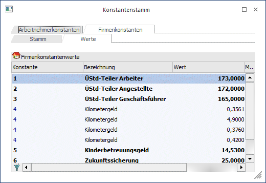 Fixbeträge, die im Firmenstamm als Konstante gespeichert werden können sind z.B. Kilometergeld, allgemeingültige Erschwerniszulagen, Stunden pro Monat, Stundenteiler für Überstundenberechnung etc.