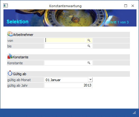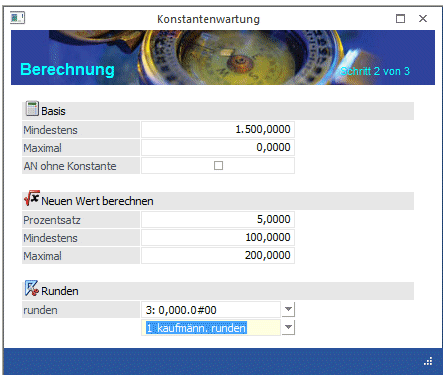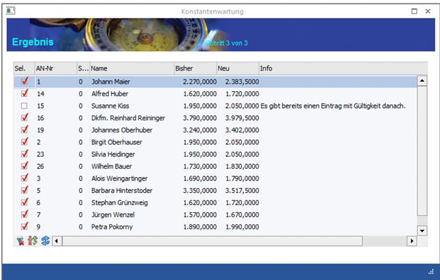 Die Konstantenwartung wird mit Hilfe eines Assistenten durchgeführt, der durch die einzelnen Schritte leitet. Bei der Konstantenwartung werden immer neue Einträge in der Konstantentabelle im AN-Stamm erzeugt, sodass immer nachvollzogen werden kann, wie sich die Konstanten mit der Zeit entwickelt haben.