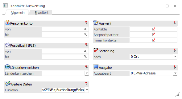 In dem Register "Allgemein" kann die Kontakte Auswertung auf Grundlage von vordefinierten Selektionsmöglichkeiten vorgenommen werden.