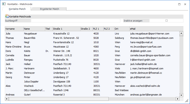Mittels der Option "inaktive anzeigen" können auch Kontakte angezeigt werden, welche im Kontaktestamm bereits mit diesem Kennzeichen versehen wurden.