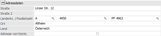 Durch Aktivieren dieser Option kann bei Ansprechpartnern definiert werden, dass die Adressdaten des Personenkontos verwendet werden sollen. Hierzu zählen die folgenden Felder: