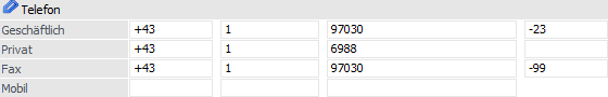 In dem Bereich "Telefon" können die Telefonnummern bzw. die Faxnummer des Kontakts erfasst werden. Pro Zeile stehen die folgenden Eingabefelder zur Verfügung: