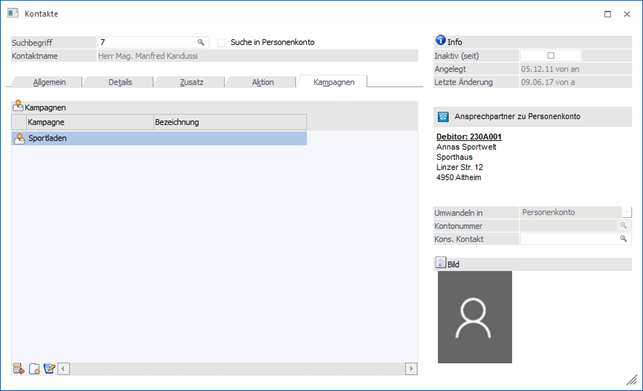 Im Register "Kampagnen" werden jene Kampagnen angezeigt, in denen der Kontakt enthalten ist.