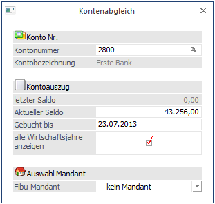 Mit der Funktion Kontenabgleich sind Sie in der Lage, alle Journalzeilen eines bestimmten Kontos mit den Zeilen Ihres Bankauszuges abzugleichen.