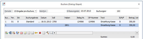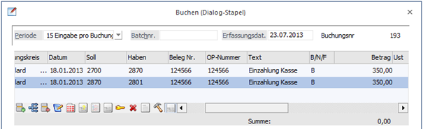 Diese Buchung kann im Buchen / Dialog - Stapel bzw. Buchen / Splitbuchung als zweizeilige Buchung erfasst werden.