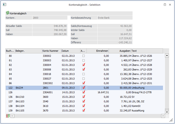 Aufgerufen. Beim Bestätigen der Maske Kontenabgleich wird Ihnen die Selektion angezeigt.