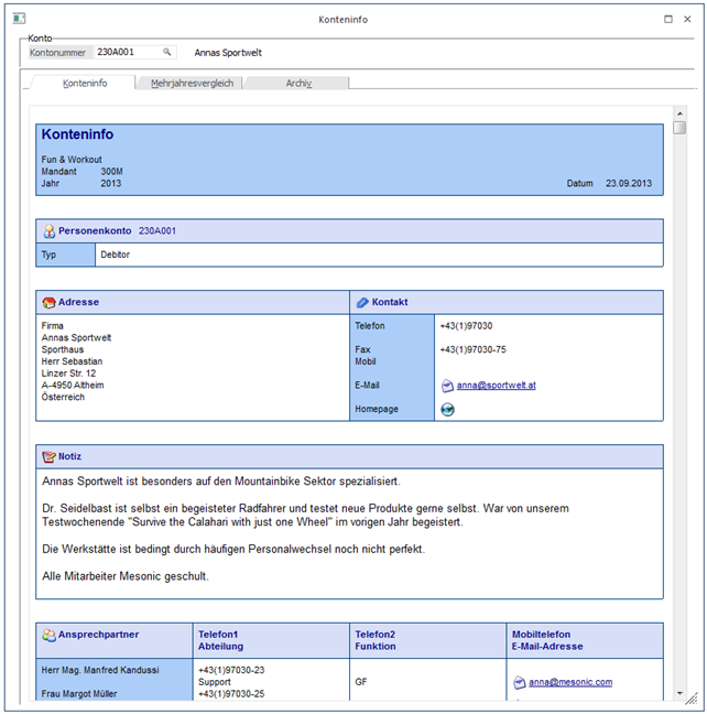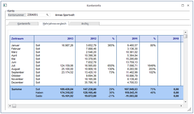 In diesem Bereich werden alle Stammdaten (z.B. bei Personenkonten: inkl. Ansprechpartner usw.) des Kontos, die Umsätze der einzelnen Monate, die Gesamtumsätze und eine Grafik der Umsätze angezeigt.