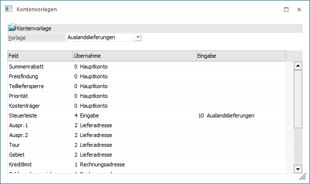 Selbst definierte Kontenvorlagen können in weiterer Folge in den Belegarten (Register "Optionen") hinterlegt werden. Sollte dort "Standard" definiert worden sein, so greifen die Standardvorgaben, welche der Beschreibung der Spalte "Feld" zu entnehmen sind.
