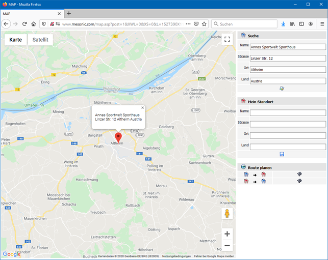 Wenn im Bereich "Mein Standort" die eigene Adresse eingegeben wird, dann kann auch die Route zum Ziel ermittelt und angezeigt werden. Die Speicherung des eigenen Standorts per Cookie ist auch möglich.