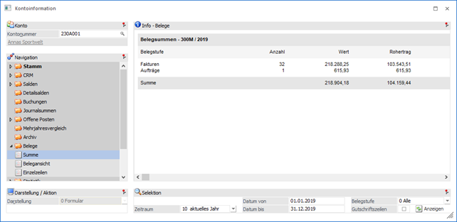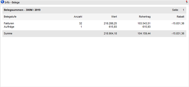 In dieser Ansicht wird für jede Belegstufe eine Summenzeile mit Wert, Rohertrag, Rabatt und Anzahl der Belege angezeigt.
