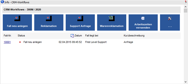 Durch Anwählen dieses Buttons kann ein weiterer CRM-Fall gestartet werden. Dabei stehen maximal 5 Workflows direkt zur Auswahl und ein weiterer Eintrag mit der Bezeichnung "Auswahl", über welchen das Fenster "Neuer Fall" aufgerufen werden kann.