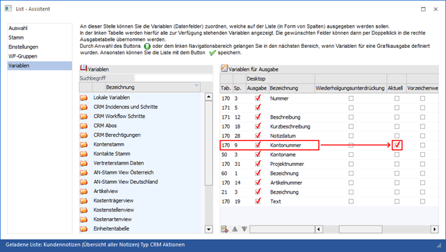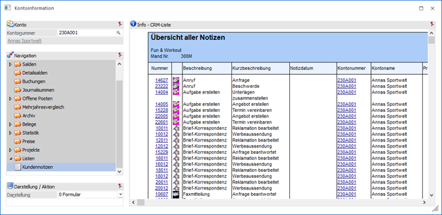 In diesem Bereich werden alle WinLine LIST-CRM-Listen angezeigt, bei denen das Feld "Kundenkonto" aus der CRM-Tabelle mit der Option "Aktuell" versehen ist.