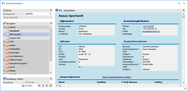 An dieser Stelle werden die Stammdaten und CRM-Aktionen des Kontos angezeigt. Des Weiteren können über den rechten Bereich der Anzeige neue CRM-Aktionen erfasst werden.