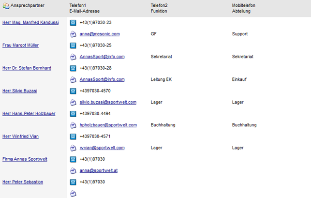 Es werden die im Register "Ansprechp." des Personenkontenstamms eingetragenen Ansprechpartner angezeigt (bei einem Klick auf den Namen wird der Kontaktestamm geöffnet, in welchem die detaillierten Stammdaten des Ansprechpartners angezeigt werden).