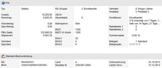 Es werden die wichtigsten Informationen aus den Registern "Fibu" und "Fakt" aus den Stammdaten angezeigt.