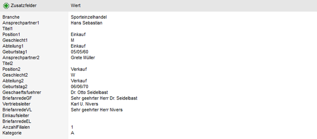 Hier werden die 30 Zusatzfelder, sowie deren Inhalt, aus den Stammdaten angezeigt.