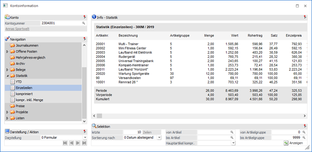 In der Ansicht "Einzelzeilen" werden die einzelnen Statistikzeilen des Kontos ausgegeben.