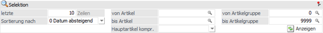 Für die Darstellung der Anzeige stehen die folgenden Einstellungen zur Verfügung, wobei die Hinterlegungen von "letzte x Zeilen", "Hauptartikel kompr." und "Sortierung nach" benutzerspezifisch gespeichert werden.